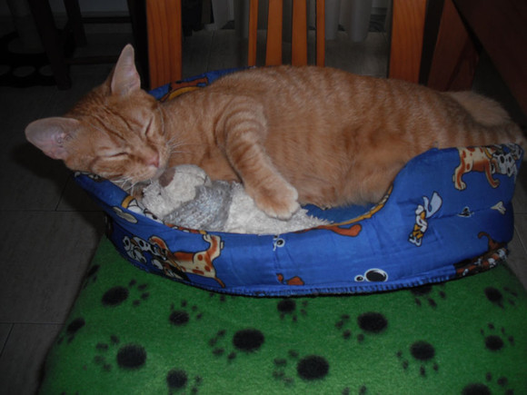 O Riscas está com a nossa família há cerca de dois anos e durante todo esse tempo, ele sempre escolheu o mesmo lugar para dormir. Este que está na imagem. Mas, não sei o que se passou, que de um momento para o outro largou a sua habitual caminha, e agora, mesmo que o coloque lá, sai imediatamente. Agora não tem um lugar fixo, umas vezes dorme no sofá, outras procura as nossas camas, de vez em quando escolhe uma cadeira que não tenha a sua alcofa. Enfim, vá se lá entender as ideias dos gatos!