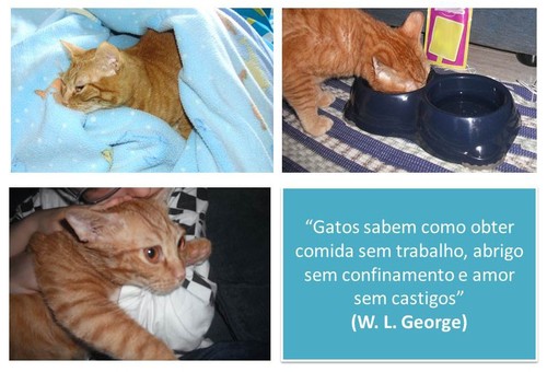 É com muita tristeza, que informo, que o Riscas partiu para o céu dos gatos. Foi um guerreiro, um lutador. Um linfoma, é sempre um linfoma, mesmo com medicação, sabíamos que não havia cura. Teve todos os cuidados, alimentação, medicação, suplementos, acompanhamento médico, amor, carinho, atenção! Foram 12 anos de partilhas. Vamos sentir, tanto, mas tanto a sua falta. Obrigada a todos os amigos, seguidores , todos os que partilham este amor pelos animais, pelos gatos. Certamente já muitos de vós passaram por esta dolorosa perda, e sabem o que custa. São como família! Adeus meu gatinho de olhos doces, cor de mel, jamais te esqueceremos!
