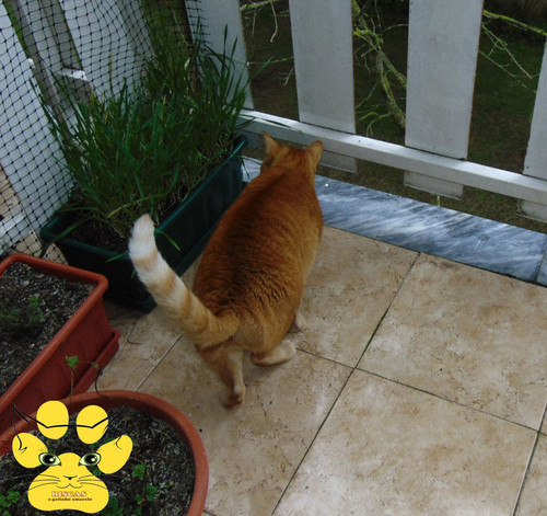 Ainda comeu a sua ervita, mas depois ouviu o chilrear de um pássaro, e voltou logo para dentro, se calhar sentiu medo. Assim que voltou, foi logo afiar as unhas!