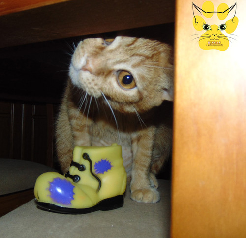 Recentemente, e por acaso, encontrei uma bota/brinquedo de roer que dizia ser para cães ou gatos, e resolvi adquiri-la. O Riscas tem brincado com ela, mas não muito. Por vezes anda com ela na boca, mas depois aquilo chia e ele larga-a.