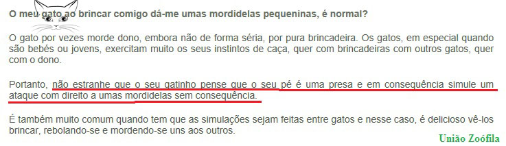 « O gato por vezes morde o dono, embora não de forma séria, por pura brincadeira. (...) Os gatos exercitam muito os seus instintos de caça, quer com outros gatos, quer com o dono. (...) não estranhe que o seu gatinho pense que o seu pé é uma presa e em consequencia simule um ataque com direito a umas mordidelas sem consequência (...)»