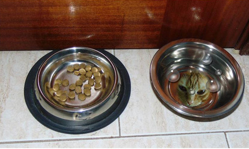 Já mudei o recipiente da água ao Riscas, mas acho que ele ao ver o seu reflexo tem algum receio, pois tenta dar patadas como se estivesse a afastar o "outro gato" da sua frente para beber água!
