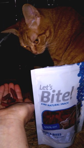 O Dr.Riscas é tão esquisito que rejeitou a guloseima que veio para ele. É uma guloseima que diz no rotulo "depois de aberta colocar no frigorifico". E sendo assim, nem a posso oferecer a outro gato.