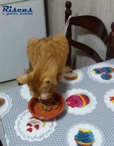 Mas isto não é um hábito. Apenas eu estava a preparar um pouco de comida húmida convencida que ele só ia cheirar e deixar...mas desta vez, até gostou e comeu!