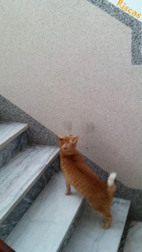 Dentro do prédio o Riscas quis ir explorar o interior das entradas para as habitações, subiu até ao andar seguinte. Mas, só sabe subir escadas, não as desce. Será normal!?