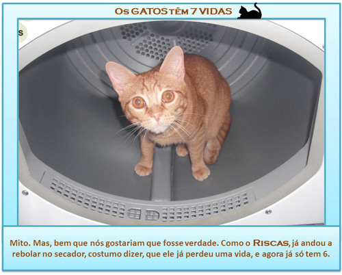 Já aqui contei o episódio em que, lamentavelmente o Riscas foi ao secador da roupa. Foi um grande susto, e agora tenho muito mais cuidado e verifico mil vezes, antes de ligar o secador se ele lá está dentro. Na altura foi um choque, mas hoje em dia, até consigo brincar com a situação e dizer que, se os gatos têm 7 vidas, o Riscas, já só tem 6, porque naquele dia perdeu uma!