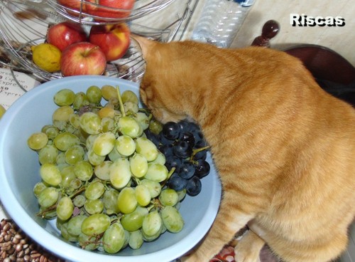 1. Vá lá, se for só cheirar não é mau. O pior é se decidir brincar com os bagos de uva,ou comê-los. As uvas são tóxicas para os cães,mas também não estou a ver um gato a comer uvas!
