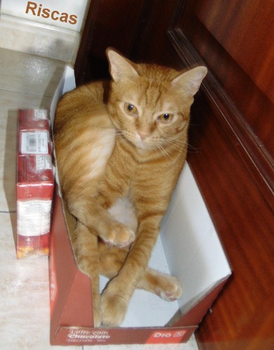 Se quero ver o Riscas feliz da vida, é dar-lhe uma caixa vazia. Ainda eu não tinha arrumado o leite que vinha dentro desta caixa, já ele  estava a entrar para dentro dela. E a forma como ele lá está dentro!? De patas cruzadas...